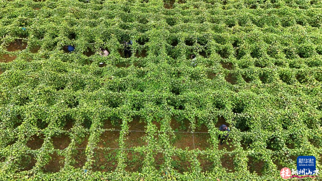 11月5日,当地村民在广西忻城县欧洞乡欧洞村百香果种植基地采摘百香果(无人机照片)。新华社发(樊绍光 摄)