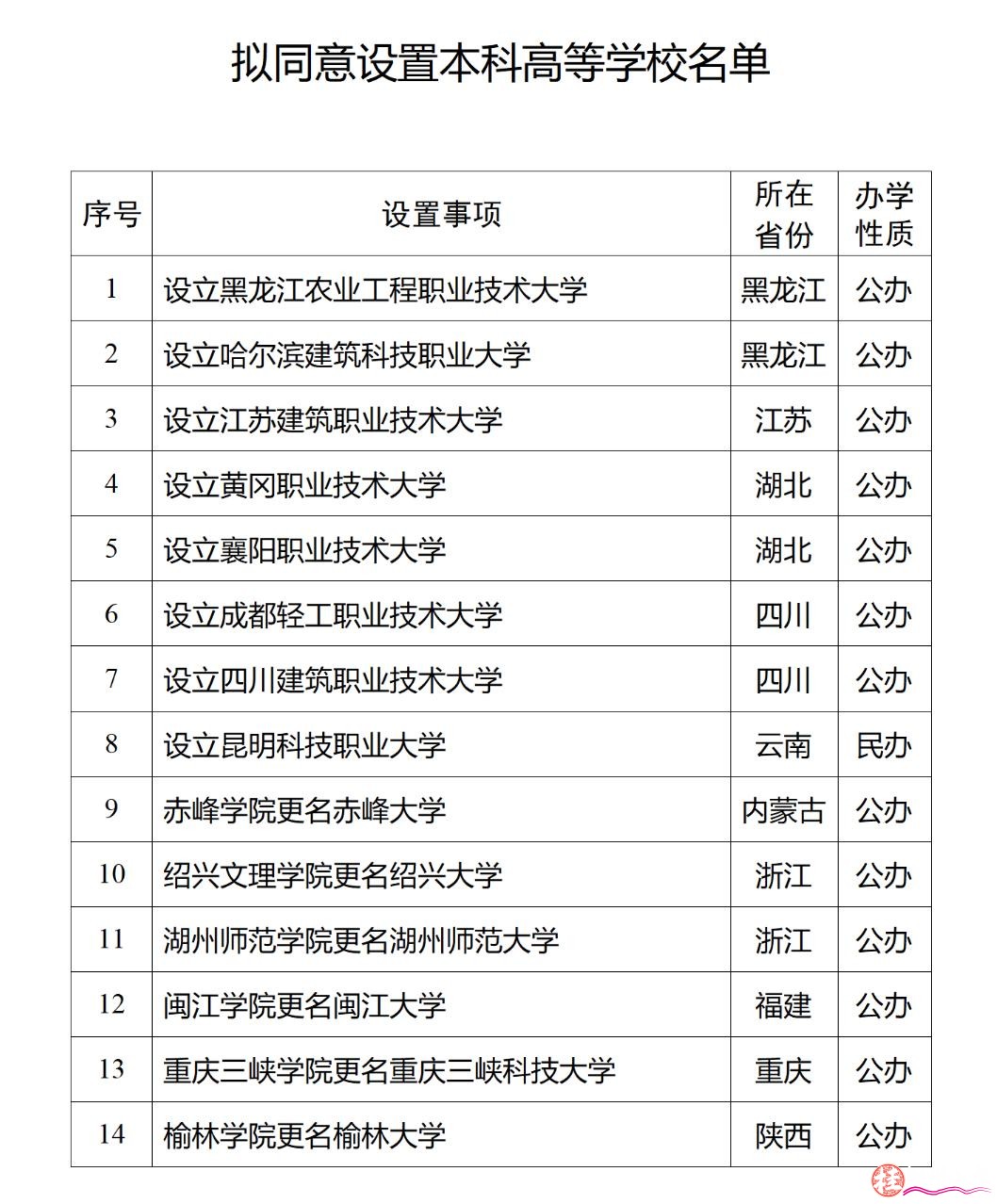 | 1月12日,教育部官网发布《关于拟同意设置本科高等学校的公示》。 根据《中华人民共和国高等教育法》《普通高等学校设置暂行条例》《普通本科学校设置暂行规定》《本科层次职业学校设置标准(试行)》等有关规定,经教育部党组会议审议,拟同意设置黑龙江农业工程职业技术大学等14所学校,现予公示。公示时间为2026年1月12日至1月16日。