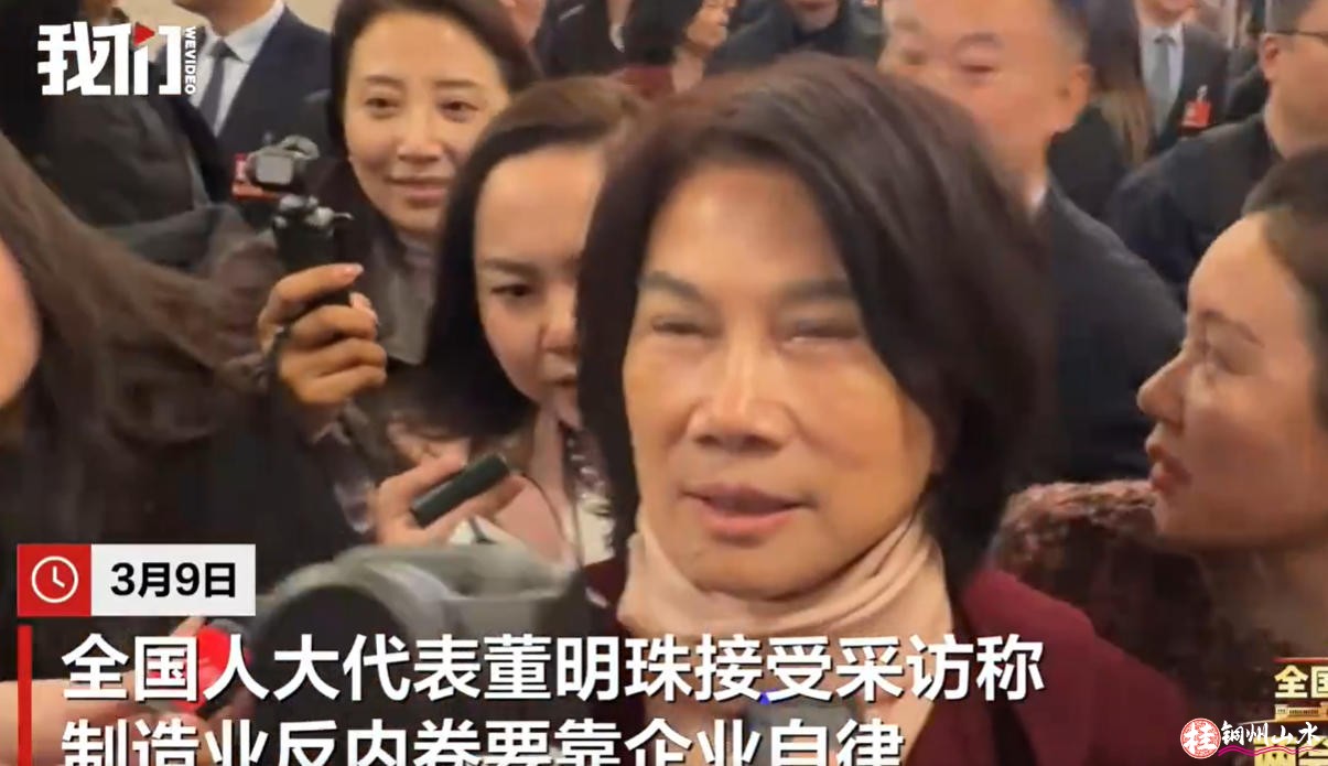 : 3月9日,全国人大代表董明珠接受采访,谈到制造业反内卷等热点话题。她说反对卷,关键是企业家和企业自己要自律,一定要把最好的产品送到市场当中去,而不能靠低价,甚至于偷工减料。这对市场和对消费者是不负责任的 ...
