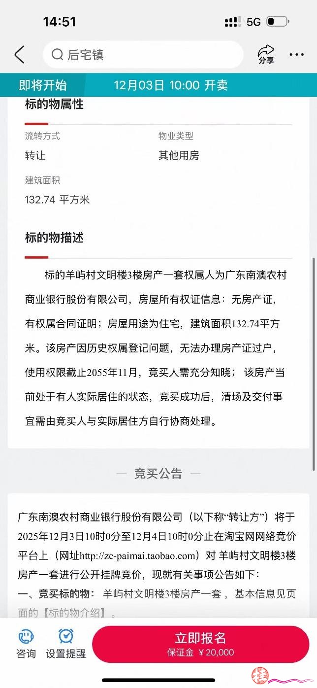 例如,广东南澳农村商业银行挂牌的汕头南澳县一处房产,面积132.74平方米,售价仅16.1万元。在标的物描述中,该房产因历史权属登记问题,无法办理房产证过户,使用权限截至2055年11月,该房产当前处于有人实际居住的状态,竞买成功后,清场及交付事宜需由竞买人与实际居住方自行协商处理。该行工作人员对记者表示,由于历史原因,目前房中有退休老人居住,拍下需要自行协商。建议购买要慎重。