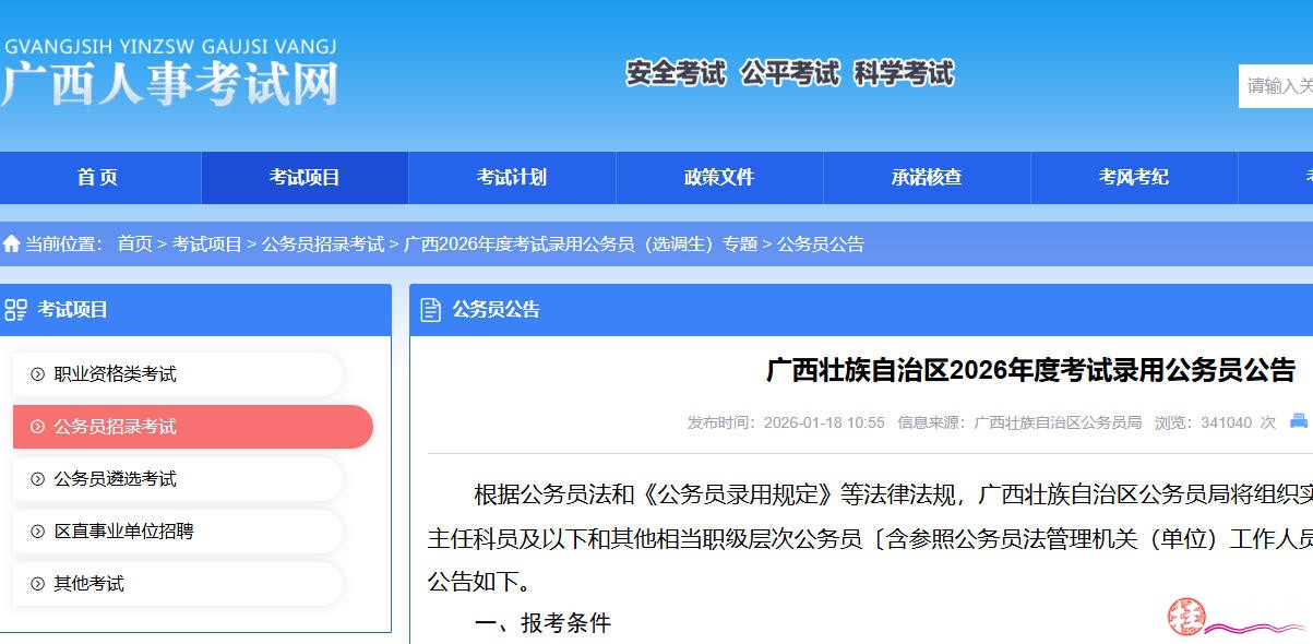 | 1月18日,《广西壮族自治区2026年度考试录用公务员公告》发布,明确本次招录报名时间为1月19日8:00至1月25日18:00,报考人员可登录广西人事考试网报名,公共科目笔试将于3月14日举行。 公告明确了报考基本条件,要求报考人员需具有中华人民共和国国籍,拥护宪法及中国共产党领导和社会主义制度,具备良好政治素质、道德品行及正常履行职责的身体与心理素质,同时需拥有符合职位要求的工作能力。 在报考年龄方面,一般职位报考者需年满18周岁、不超过38周岁(1987年1月19日至2008年1月19日出生)。2026年应届硕士、博士研究生,以及退役军人、海监(渔政)船员、艰苦边远地区乡镇职位报考者,年龄可放宽至43周岁,具体是否放宽由招录机关结合工作实际确定。优秀村(社区)干部报考相关职位年龄同样放宽至43周岁,获省部级以上奖励者可进一步放宽至45周岁。司法行政、公安等系统人民警察职位年龄有专项要求,其中特警职位年龄限定为25周岁以下。 在学历要求方面,本次招录以大学专科及以上文化程度为基准,优秀村(社区)干部职位学历可放宽至高中、中专。法院、检察院法官及检察官助理职位需具备普通高等学校政法专业本科以上学历及学士以上学位。非普通高等学历教育毕业生、留学回国人员等需按要求提供相应学历认证材料,技工院校特定班次毕业生可按规定比照相应学历报考。 对于明确要求有基层工作经历的职位,报考人员需具备县级以下党政机关工作经历、各类企业事业单位工作经历、村(社区)组织及社会组织工作经历、基层见习或项目研究经历,或军队团及以下单位服役经历等五类情形之一,全日制就读期间的社会实践、实习等不纳入基层工作经历认定范围。 同时,定向招录职位设置明确资格标准:服务基层项目人员需服务满2年且考核合格,部分退役军人及艰苦边远地区事业单位工作人员可报考相关定向职位;优秀村(社区)干部需连续任职满3年且在岗,仅限报考工作地所在县域职位;退役军人定向职位面向依法退出现役的军(警)官、军士、义务兵等人员开放。 本次招录的具体职位资格条件可查阅《广西壮族自治区2026年度考试录用公务员职位计划表》,考生需在规定时间内完成报名,严格按照公告要求准备报考材料,确保信息真实准确。(记者彭媛媛) 附件:广西壮族自治区2026年度考试录用公务员职位计划表 https://www.gxpta.com.cn/ksxm/gwyzlks/gx2026ndkslygwyxdszt/2026ngwygg/P020260118397898449695.xlsx |